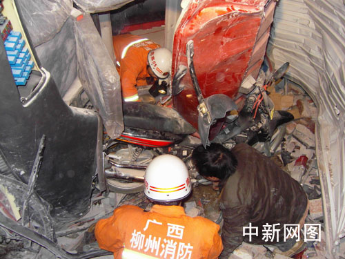 柳州鹿寨消防中隊接警后,立即出動一輛搶險救援車和6名官兵趕往事故現(xiàn)場。在現(xiàn)場,已聚集了眾多民眾,公安、120醫(yī)護人員已經到場。此時出事貨車車身已“霸占”了三個門面,車頭鉆入一修理店店鋪,地上散落著鐵礦和從屋頂?shù)袈涞氖尥摺?/p>