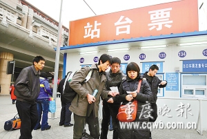 一個(gè)成功率不足10%的回渝攻略,正被很多農(nóng)民工相互交流著,因?yàn)樗挥脫?dān)心買到票販的假票,也不用花錢買高價(jià)票,只要買一張面值1元的站臺(tái)票,就有可能搭上回家的列車。