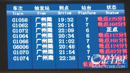到晚上6時30分,現(xiàn)場LED顯示屏顯示,從原定下午5時06分發(fā)出的9個班次列車都處于晚點狀態(tài)中,車站所有站臺上都沒有列車停靠,數(shù)千旅客因此滯留廣州南站內(nèi)。