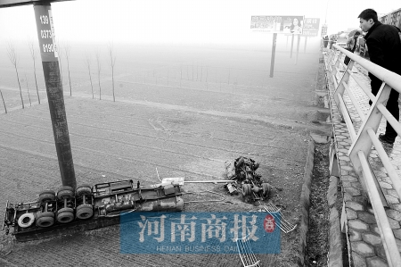 從事故地點由南向北走約200米處橋體東側,同樣有一段護欄被撞開約50米長的豁口。橋下,一輛白色油罐車車頭與車身分離,倒扣在田地里。油罐車車頭下方壓著一根路燈線桿。