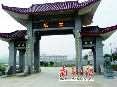 大坑村是一個(gè)偏遠(yuǎn)的革命老區(qū)村。從鎮(zhèn)場(chǎng)輾轉(zhuǎn)乘車(chē)幾公里,遠(yuǎn)遠(yuǎn)可見(jiàn)青瓦大理石牌坊高聳于村口,上面紙貼的“大坑”二字顯得粗糙而扎眼。