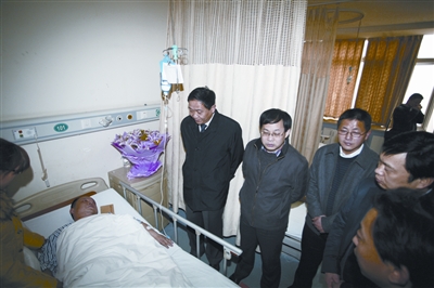 大年初二,在連續(xù)工作近一個月后,37歲的江漢區(qū)城管執(zhí)法大隊直屬六中隊隊員劉漢橋突發(fā)腦溢血。昨日(21日)下午,江漢區(qū)委書記張平、區(qū)長李強來到協(xié)和醫(yī)院,看望了劉漢橋及妻子,并送去鮮花、慰問金和營養(yǎng)品。