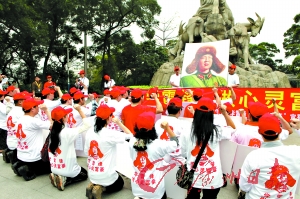 宣誓完畢,活動進(jìn)入高潮,“老板們”后退一步,轉(zhuǎn)過身來面對著雷鋒畫像,齊齊雙膝跪地,以表示“對雷鋒精神的虔誠和最高敬意”,然后起立對畫像三鞠躬。隨后,這些人又向路人散發(fā)活動的紅色文化帽和文化衫,以號召更多人“向雷鋒同志學(xué)習(xí)”,把雷鋒精神轉(zhuǎn)化為自己的“心靈財(cái)富”。