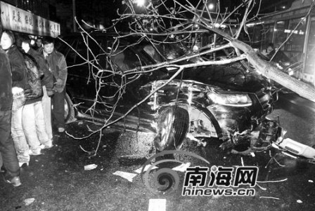 據(jù)目擊群眾介紹:當(dāng)時這輛越野車從五指山路一單位開出來,越道沖到馬路對面“新香梅休閑中心”前的人行道上來。當(dāng)時正在清掃馬路的一名女清潔工急忙閃到一邊,她清運垃圾的拖車被這輛越野車撞翻在地,車被撞散架,整車的垃圾全部倒了出來。接著,這輛越野車撞斷人行道上的一棵碗口粗的遮蔭樹,把停在人行道上2輛摩托車撞倒后,并沒有停下來,它沿著人行道往前沖,沖出50多米遠(yuǎn)后,又在芳草園前面的人行道上撞破了一處墻角,撞倒了5輛停放好的摩托車,并把一棵碗口粗的遮蔭樹撞斷后連根帶走,還把路邊一位準(zhǔn)備騎電動摩托車的男子撞飛。肇事車接著從人行道開到五指山路上后,汽車的右前輪拐斷倒向一邊,開不動后才停下來。從這輛肇事車上隨后下來幾名男子。交警趕到現(xiàn)場后,把肇事司機(jī)帶到了交警事故處理車上。那名被撞傷的男子隨后被120救護(hù)車送往醫(yī)院。