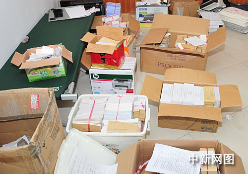 據(jù)悉,警方共奔赴13個(gè)抓捕點(diǎn)。記者在一個(gè)抓捕點(diǎn)看到,除了一張上下鋪鋼絲床,其余地方都被各類的紙箱占據(jù)。民警隨意打開(kāi)地上的紙箱,里面都是各式各樣的假發(fā)票,不僅是浙江省范圍內(nèi)的,上海、山東、江蘇等地的假發(fā)票也隨地都是。經(jīng)清點(diǎn),民警一共繳獲各類假發(fā)票21.3萬(wàn)份,同時(shí)還繳獲了3套電腦、打印機(jī)、掃描儀等印制發(fā)票用普通設(shè)備以及400余枚開(kāi)具假發(fā)票所使用的偽造公章、假證等作案工具。