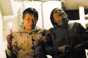 昨天晚上9點45分,死者張某的家人們依然留在樓道內(nèi),把點燃的蠟燭安放在6樓至1樓間的走道上。家人們說,晚上把蠟燭點在樓道上,是想讓逝者“平安下樓”。
