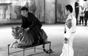 都說老虎的屁股摸不得,而讀者王先生日前反映,在溫州動物園,游客不僅可以近距離和老虎合影,而且還能騎在虎背上“喊茄子(拍照)”。王先生認為這太危險了。