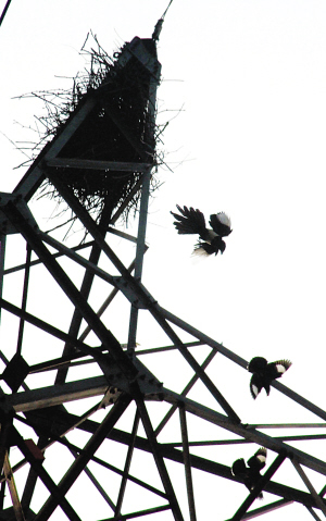 附近的居民武先生告訴記者,就在半個(gè)月前,他散步路過(guò)這座高壓電線架下,忽然有一根細(xì)樹(shù)枝從空中掉了下來(lái),隨之聽(tīng)到上面?zhèn)鱽?lái)一陣陣悅耳的鳥(niǎo)叫聲。抬頭一看,發(fā)現(xiàn)是兩只喜鵲銜著樹(shù)枝站在電線架頂部的鋼架上,像是在討論什么似的——估計(jì)這是一對(duì)夫妻,它們開(kāi)始搭窩了。