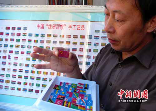 中新網(wǎng)4月30日電(馮文芳)為迎接舉世矚目的上海世博會(huì),山西侯馬工程師郝建安用直徑為0.78毫米的彩色電纜線(xiàn),制作出方寸大小的世界各國(guó)國(guó)旗,喜迎上海世博會(huì)。他編制的國(guó)旗結(jié)構(gòu)緊湊,造型嚴(yán)謹(jǐn),微觀寫(xiě)意,巧妙夸張,富有立體感。