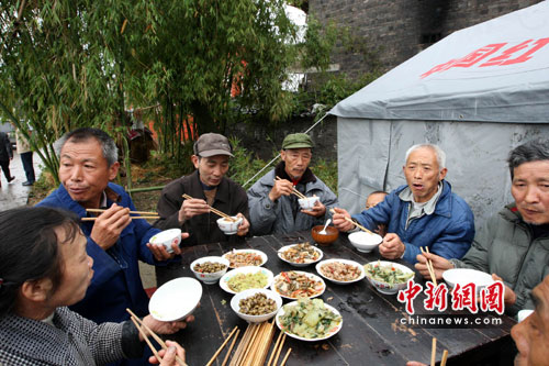 7日中午,記者在重慶墊江縣沙坪鎮(zhèn)李白村一災(zāi)民安置點(diǎn)看到,8名受災(zāi)群眾正吃著熱氣騰騰的飯菜!白约曳课菰5日晚被風(fēng)暴雨吹跨后,今天是在災(zāi)后第一次吃上了熱飯菜!币秽嵭沾迕窀嬖V記者,除能吃上熱騰騰的飯菜外,他們的安置帳篷也已搭建完畢。