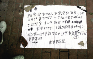 “相親男”還在紙上特別注明“要來(lái)真的”,他想表達(dá)的意思為“非誠(chéng)勿擾”。另外,紙上還注明“我沒(méi)時(shí)間了”。對(duì)此,“相親男”解釋,他已經(jīng)30歲了,正常渠道找對(duì)象已經(jīng)沒(méi)時(shí)間了,“身體沒(méi)問(wèn)題,絕對(duì)健康”!跋嘤H男”還透露自己是樂(lè)清北白象人,但拒絕透露姓名。