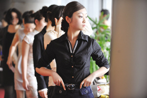 候場(chǎng)區(qū),美女云集的地方,只要一個(gè)轉(zhuǎn)身,你就可以看見(jiàn)近千名佳麗有的在偷偷補(bǔ)妝,有的對(duì)著鏡子練習(xí)微笑。在等候面試的美女中,有帶著綠色美瞳的美國(guó)加州留學(xué)生,有穿背帶褲剛剛高中畢業(yè)的學(xué)生,還有身著職業(yè)裝想換個(gè)工作的公司白領(lǐng)!艾F(xiàn)在工作不好找,所以只要有招聘就來(lái)試試咯!边@是記者在現(xiàn)場(chǎng)聽(tīng)到最多的一句話。