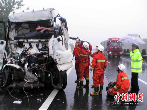 21日早上7時08分,新余市渝水消防二中隊接到報警,距離滬昆高速新余服務區(qū)1公里處,兩輛貨車發(fā)生追尾事故,其中運石油的貨車內有2名人員被困,請求救援。二中隊接警后立即出動1輛消防車和7名官兵趕赴現場。