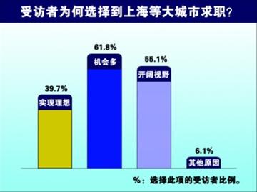 針對目前在上海讀書以及曾經(jīng)在上海讀書的部分人群調(diào)查顯示,有43.2%的受訪者坦言,當(dāng)初到上海求學(xué),就是希望畢業(yè)后留在上海工作或生活; 55.6%的人認(rèn)為學(xué)校教育質(zhì)量好, 22.7%的人以在上海等大城市上學(xué)為榮。