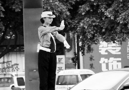 照片內(nèi)容大同小異:在一個(gè)路口崗?fù)ぃ幻叭蔽溲b”的女交警,變換著手勢(shì),指揮過(guò)往車(chē)輛和行人通行。