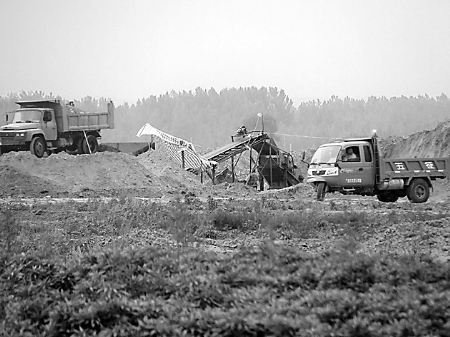 耕地已被毀,機(jī)械穿梭忙,振動篩正在向車上裝沙