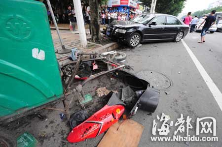 目擊者鄭小姐說,當(dāng)時她騎著電動車,在豪華轎車后面,與其同向行駛。豪華轎車先刮碰到一名騎自行車的女子,接著,非機動車道上一名騎摩托的男子和一名騎電動車的男子被撞飛,高度超越小車車頂,又重重摔到了人行道上。附近商家則說,豪華車是為躲避騎自行車的女子,打方向盤向右避讓,隨即撞上兩名騎車的男子!叭绻麤]這棵樹就慘了,可能更多人被撞!备呦壬男≤嚠(dāng)時就停在事發(fā)地附近等朋友。他說,他先是聽到一聲刺耳的剎車聲音,循聲看去,看到兩名騎車男子被撞飛。另有目擊者說,豪華車撞人后繼續(xù)往前沖,撞倒路邊的電話亭,再撞上行道樹后才停下。受傷的三人中,一人昏迷不醒,滿身是血。豪華車司機沒有受傷。