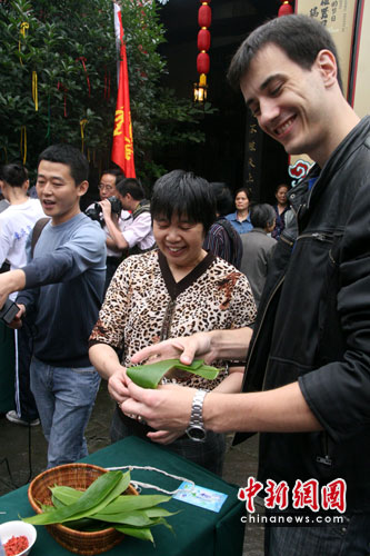 中新網(wǎng)重慶6月12日電 (孟幻)端午將至,包粽子、掛菖蒲……中國(guó)傳統(tǒng)習(xí)俗不能少。12日,匈牙利、柬埔寨等駐渝領(lǐng)事官員與20余個(gè)國(guó)家的留學(xué)生在重慶千年古鎮(zhèn)磁器口親手包粽子,與中國(guó)傳統(tǒng)習(xí)俗來了一次零距離接觸。