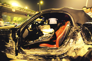 “乖乖,我跟在他后面說(shuō)他要出事,這車開(kāi)得像飛一樣,果不其然才一分鐘不到,真的出事了!蹦繐羰忻裢蹰L(zhǎng)來(lái)先生說(shuō),事發(fā)時(shí)這輛寶馬跑車從新街口方向,由東向西沿漢中路如飛一樣開(kāi)去。由于車速很快,加上深夜寶馬跑車發(fā)出噪音,讓馬路上同方向車輛躲閃不及,其車子后面好像還有一輛超速跑車,王長(zhǎng)來(lái)先生懷疑兩車在超速飆車!笆袇^(qū)內(nèi)貼地飛行能不出事嗎?”王長(zhǎng)來(lái)說(shuō),他跟到漢中門(mén)長(zhǎng)途汽車站門(mén)口,寶馬Z4敞篷跑車速度快得讓他吃驚,突然在漢中門(mén)高架下,這輛寶馬車與一輛本田商務(wù)車相撞,商務(wù)車左側(cè)車頭被撞得粉碎,寶馬車則丟失了自己的左側(cè)車門(mén),騰空在原地打了一個(gè)180度轉(zhuǎn),原本車頭向西被撞擊后,車頭一下子朝東了。