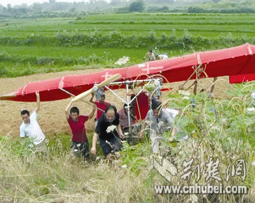 5月10日,武漢東湖開發(fā)區(qū)農民舒滿勝,花費10萬元自造土飛機,試飛失敗并受皮外傷。昨日上午,舒滿勝的土飛機再次試飛,未像上次一樣通知媒體,當地部分村民目擊了全過程。據目擊者胡先生介紹,昨日上午9時許,舒滿勝的土飛機就被拉到江夏區(qū)五里界鎮(zhèn)醬栗廟路段,在經過三四十分鐘的試驗性滑行后,于上午10時準時起飛。土飛機“助跑”約200米后,舒滿勝拉動起飛桿,飛機輪滑輪脫離地面,機身離地面只有兩三米,飛行不過10米,一頭栽進路邊稻田里(如圖),舒滿勝被甩出飛機左腿受傷。隨后,舒滿勝被送往流芳醫(yī)院。經檢查,其左腿髕骨骨折,需手術治療。