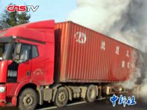 大貨車(chē)高速公路上輪胎起火 高溫致貨品燃燒