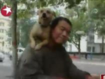 主人將小狗扛在肩上騎車出門