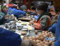 【解說(shuō)詞】“萬(wàn)家宴”現(xiàn)場(chǎng),各種菜式琳瑯滿(mǎn)目。有用糕點(diǎn)制成的“家和萬(wàn)事興”;有用紅蘿卜、青辣椒、大蒜頭做成的“福娃”;還有用茄子、胡蘿卜、雞蛋等食材制作的“國(guó)畫(huà)系列菜”——“梅花歡喜漫天雪”、“松鶴延年”等。每一道菜里都有一個(gè)故事,每一道菜里飽含一份情誼。