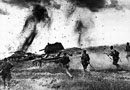 戰(zhàn)爭初期,蘇軍積極防御。1941年10月─1942年1月,蘇軍殲敵50多萬,取得了莫斯科會(huì)戰(zhàn)的勝利,使希特勒“閃電戰(zhàn)”慘遭失敗。1942年11月19日,蘇軍展開反攻,次年,迫使希特勒轉(zhuǎn)入戰(zhàn)略防御。