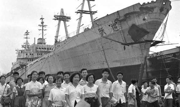 1958年11月27日,中國第一艘萬噸遠(yuǎn)洋貨輪“躍進(jìn)號(hào)”下水。這艘遠(yuǎn)洋貨輪由大連造船廠建造,使用當(dāng)時(shí)最新的技術(shù)裝備。它全長169.9米,載貨量1.34萬噸,排水量為2.21萬噸,能在封凍的區(qū)域破冰航行。