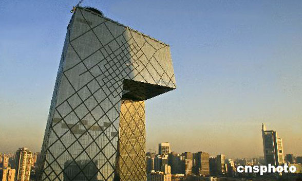 央視新址工程位于北京市朝陽區(qū)中央商務區(qū)(CBD)核心地帶,2004年9月開工。其兩棟主樓分別為52層、高234米和44層、高194米,并由懸臂鋼結構連接,總建筑面積495900平方米,號稱“中國公共建筑‘第一單’”。央視新址懸臂鋼結構即兩棟主塔樓分別以大跨度外伸部分在162米以上高空懸挑75.165米和67.165米,然后折形相交對接,在大樓頂部形成折形門式結構體系。懸臂共14層、寬39.1米、高56米,用鋼量為1.8萬噸,相當于將中國第一鋼廈深圳發(fā)展中心懸空建造。