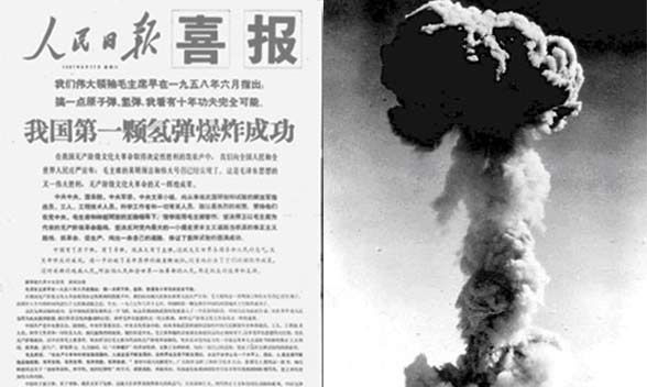 在氫彈爆炸成功的同時,中國政府重申:“中國進行必要而有限制的核試驗,發(fā)展核武器,完全是為了防御,其最終目的就是為了消滅核武器”!霸谌魏螘r候,任何情況下,中國都不會首先使用核武器。”