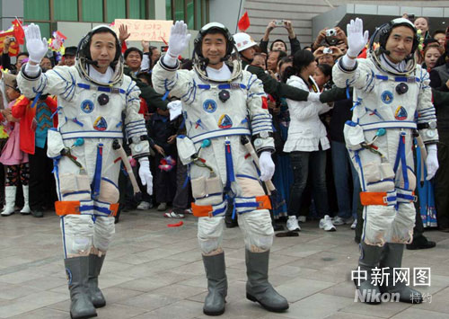 圖:“神七”航天員向送行人員致意