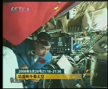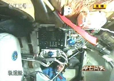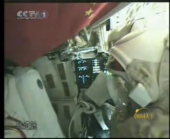 圖:翟志剛在軌道艙確認艙門檢漏情況