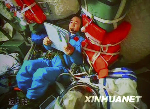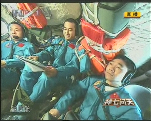 圖:神舟七號返回在即航天員穿好艙內(nèi)服