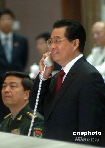 胡錦濤與完成首次太空出艙活動航天員進行天地通話