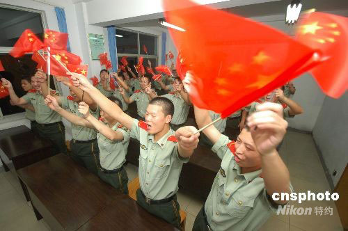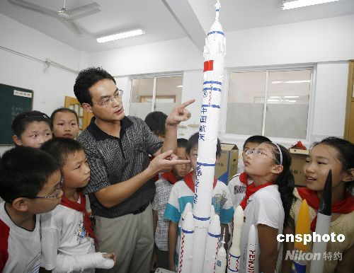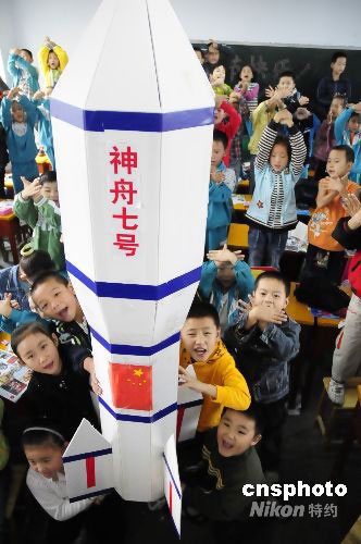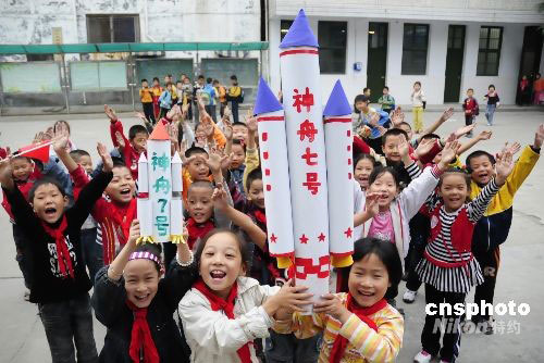 圖:常萬全家鄉(xiāng)小學生祝“神舟七號”發(fā)射成功