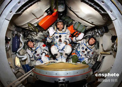 圖:三名“神七”航天員進入返回艙