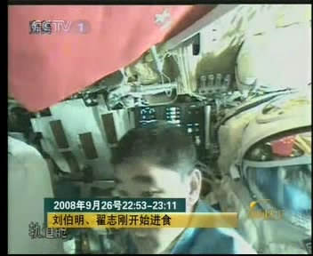 圖:神舟七號航天員在軌道艙內(nèi)進食