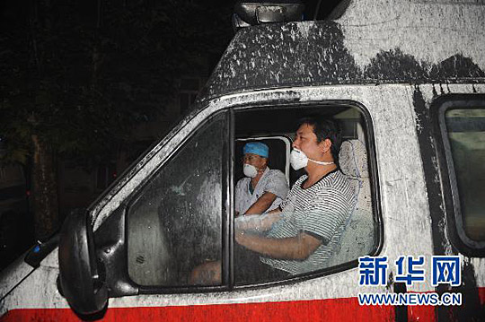 圖:大連新港輸油管道爆炸起火 救護人員在事故現(xiàn)場