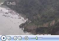 航拍堰塞湖淹沒(méi)北川漩坪救災(zāi)點(diǎn)