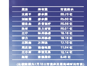 作為今年上半年身家縮水最多的創(chuàng)業(yè)板富豪,碧水源的文劍平與劉振國,其市值相比最高峰時分別縮水了33.73億和25.30億,其縮水比例高達(dá)51.35%。而同樣在創(chuàng)業(yè)板富豪身家縮水排行榜中名列前十的趙敏,按寶德股份7月13日收盤價16.67元來算,現(xiàn)持有4590萬股市值為7.65億,相比其最高市值時的17.14億,財富縮水了9.48億,其縮水比更是高達(dá)55.35%,成為今年上半年縮水比例最高的創(chuàng)業(yè)板富豪。而寶德股份、碧水源、金亞科技及東方財富則成為今年上半年創(chuàng)業(yè)板縮水最大的個股,股價分別縮水55.35%、51.35%、50.00%和49.99%。