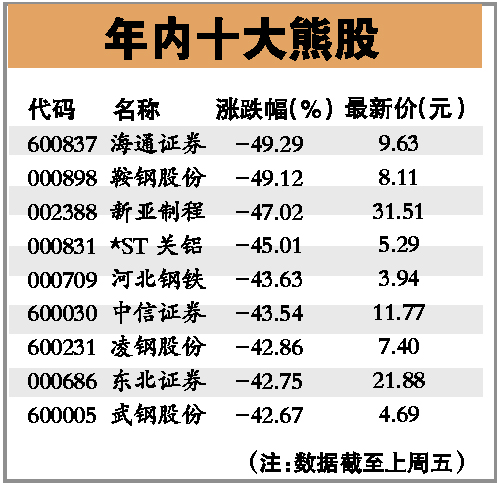 盡管截至上周五,大盤年內(nèi)跌666.40點,跌幅高達(dá)20.33%,不過,許多股票卻創(chuàng)出歷史新高。本報統(tǒng)計發(fā)現(xiàn),截至上周五,兩市A股中,有100多只股票年內(nèi)漲幅超過50%,20只股票年內(nèi)漲幅超過100%,三只股票年內(nèi)漲幅更是高達(dá)200%以上(含200%)。