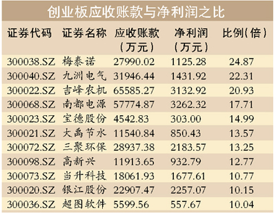 同花順資訊統(tǒng)計顯示,創(chuàng)業(yè)板公司應(yīng)收賬款竟是凈利潤20倍以上的公司有3家,其中梅泰諾(300038)的應(yīng)收賬款竟是凈利潤的24.87倍,位居榜首;九洲電氣(300040)的應(yīng)收賬款竟是凈利潤的22倍,位居第二。應(yīng)收賬款與凈利潤之比大于10倍的有11家。創(chuàng)業(yè)板中,應(yīng)收賬款最低的是三五互聯(lián)(300051.SZ),其中報凈利潤為1694.27萬元,而應(yīng)收賬款僅為157.97萬元。