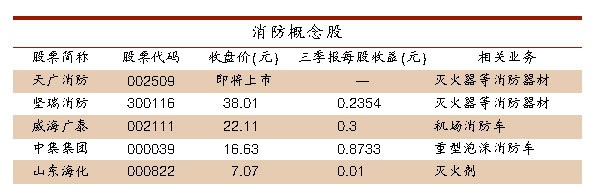 某不愿具名的私募人士向 《每日經(jīng)濟新聞》記者介紹,目前A股市場包括即將上市的天廣消防(002509)在內(nèi),涉及到消防器材及其相關(guān)領(lǐng)域的上市公司共有5家。其中,9月份剛登陸創(chuàng)業(yè)板的堅瑞消防(300116,收盤價38.01元)和即將登陸深圳中小板的天廣消防均為一線消防設(shè)備生產(chǎn)制造商;威海廣泰(002111,收盤價22.11元)等公司為輔助設(shè)備生產(chǎn)制造商。