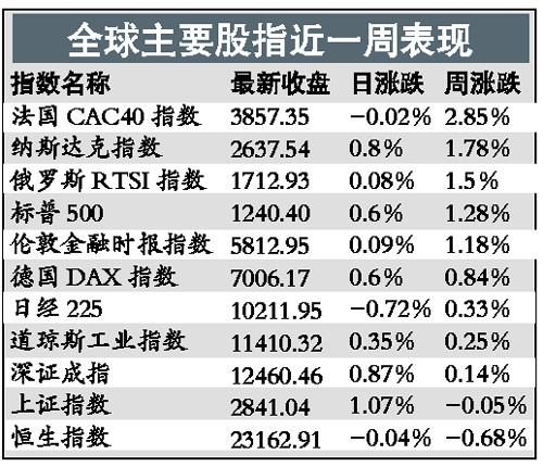 受到一系列利好數(shù)據(jù)的刺激,上周五美國(guó)三大股指全線上漲,標(biāo)普500指數(shù)和納斯達(dá)克指數(shù)更是分別收于兩年及三年以來(lái)的最高水平。分析人士預(yù)計(jì)全球股市年內(nèi)還有上漲的機(jī)會(huì)。