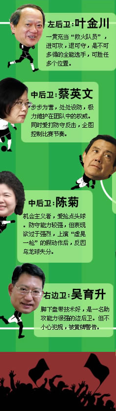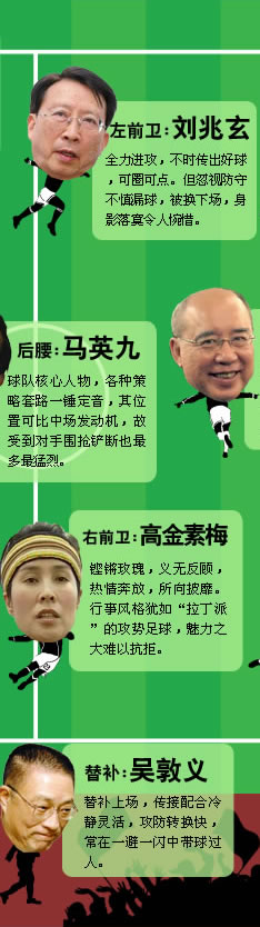 2009年大幕即將落下,臺(tái)灣政壇照舊精彩紛呈,多路人馬粉墨登場(chǎng)。在這個(gè)情節(jié)跌宕起伏、堪比“足球甲級(jí)聯(lián)賽”的舞臺(tái)上,眾“球員”充分展示出個(gè)人技術(shù)和力量。中新網(wǎng)特別從各支“參賽隊(duì)伍”中精挑細(xì)選,組成“本年度全明星陣容”,藉此梳理臺(tái)灣政壇發(fā)生的那些人和事,以饗諸位“球迷”。