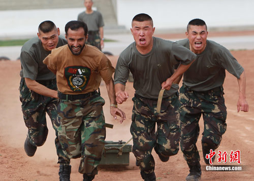 7月4日,參加“友誼—2010”中國巴基斯坦反恐聯(lián)合訓(xùn)練的兩軍士兵進行體能訓(xùn)練。此次訓(xùn)練在中國寧夏青銅峽地區(qū)展開,主要以邊境地區(qū)山地聯(lián)合反恐作戰(zhàn)為課題,分為展示交流、混編同訓(xùn)、綜合演練三個階段。這是兩國之間舉行的第三次反恐聯(lián)合訓(xùn)練。中新社發(fā) 杜洋 攝