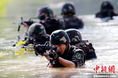 7月5日,中巴兩軍特戰(zhàn)士兵展開高強度魔鬼訓(xùn)練。此次代號為“友誼—2010”的中國巴基斯坦反恐聯(lián)合訓(xùn)練在中國寧夏青銅峽地區(qū)展開,訓(xùn)練主要以邊境地區(qū)山地聯(lián)合反恐作戰(zhàn)為課題,分為展示交流、混編同訓(xùn)、綜合演練三個階段。 中新社發(fā) 杜洋 攝