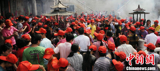 隨著媽祖羽化升天紀(jì)念日臨近,前往福建莆田湄洲媽祖祖廟謁祖進(jìn)香的海內(nèi)外媽祖信眾絡(luò)繹不絕。圖為廣東中山市瞻部洲勝母宮600多位媽祖信眾組成謁祖進(jìn)香團(tuán),恭請(qǐng)100多尊神像到湄洲媽祖祖廟謁祖進(jìn)香,該進(jìn)香隊(duì)伍人員都是在廣東辦廠經(jīng)商的臺(tái)胞。高亞成 攝
