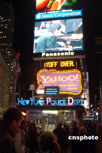 中國著名青年鋼琴家郎朗與中國愛樂樂團(tuán)在北京第十屆國際音樂節(jié)上合作演出鋼琴協(xié)奏曲《黃河》,美東時間十月二十五日晚七時,紐約地標(biāo)時代廣場前的巨大電子顯示屏組進(jìn)行轉(zhuǎn)播,吸引大量來自全球各地的旅游者和當(dāng)?shù)厝笋v足欣賞。中新社發(fā) 鄧悅 攝